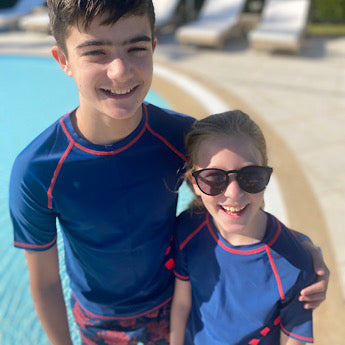 We design our swimwear to be skin fit on an average child within the older year within each range (eg 7 within 6/7y), so if in doubt, we recommend that you go a size up.