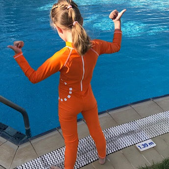 In the same vein, our all-in-ones are not designed as warmth suits, but the extra coverage along the arms and legs will provide a modest amount of warmth when worn in cooler water: perfect if your child is finding their swimming lessons a little too cold.