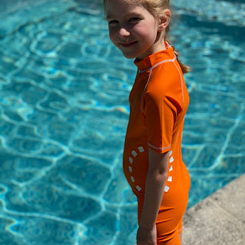 In the same vein, our all-in-ones are not designed as warmth suits, but the extra coverage along the arms and legs will provide a modest amount of warmth when worn in cooler water: perfect if your child is finding their swimming lessons a little too cold.