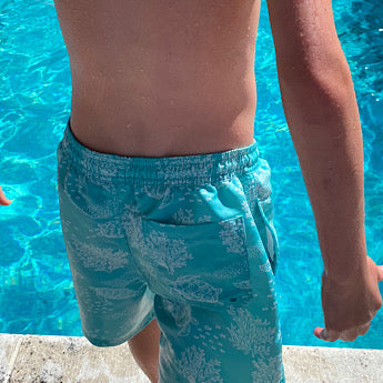 The fabric for our board shorts is 100% recycled polyester, from post-consumer waste, such as plastic bottles, including ocean plastics. The fabric is a sturdy (almost indestructible) weight and weave so you will get years and years of use out of them. Stitched to last and pass between siblings and friends. When you have finally finished with them, send them back to us for re-recycling.